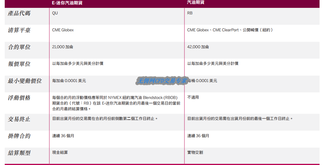 汽油合约价格以美元和美分/加仑计,每一单位为 42,000 加仑作为基准合约,21,000 加仑则为 E-迷你期货合约。E-迷你合约是以标准石油期货合约的清算价格为基准进行现金结算。