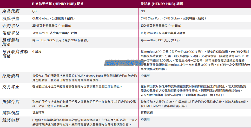 天然气期货的合约价格以美元和美分/百万英国热量单位(mmBtu) 计算,每一单位为 100 亿 mmBtu 作为基准合约,25 亿mmBtu 则为 E-迷你期货合约。E-迷你合约是以标准亨利港天然气期货合约的清算价格为基准进行现金结算。